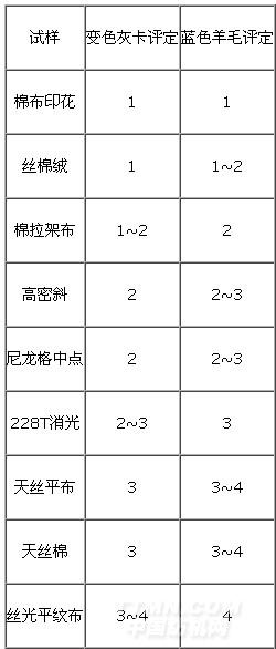 表3用變色灰卡和藍色羊毛評定耐光色牢度的結果比較