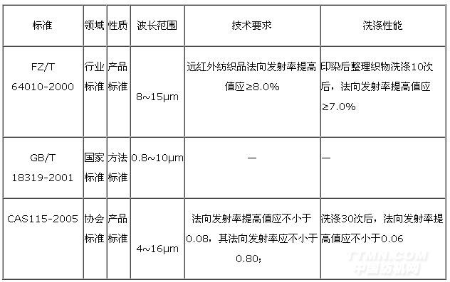 目前關(guān)于遠(yuǎn)紅外紡織品功能測試標(biāo)準(zhǔn)主要有國家標(biāo)準(zhǔn)GB/T 18319—2001《紡織品紅外蓄熱保暖性的試驗(yàn)方法》、紡織行業(yè)標(biāo)準(zhǔn)FZ/T 64010—2000《遠(yuǎn)紅外紡織品》、中國標(biāo)準(zhǔn)化協(xié)會(huì)標(biāo)準(zhǔn)CAS 115—2005《保健功能紡織品》。