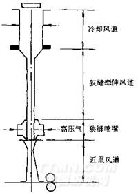 美國Ason提出如圖3-7-15所示的絲條線密度與絲條速度的關(guān)系曲線,要獲得細旦絲就必須提高絲條牽伸速度。而絲條速度取決于氣流速度。為此研制成功了以壓縮空氣為動力引射牽伸絲束的狹縫式噴嘴。壓縮空氣引射絲條及冷卻風(fēng)、自然風(fēng)進入噴嘴狹縫,在狹縫處絲條被高速氣流拉伸。噴嘴狹縫的高度有限,氣流挾持著絲束以高速離開噴嘴出口,設(shè)計噴嘴出口氣流速度為70~90m/s,離開噴嘴即在自然空間擴散,此時絲條向下運動呈擺動,抖動像S形運動,且在運動下落的同時,仍然對絲條起拉伸作用。
