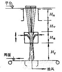 冷卻風(fēng)道底部至牽伸噴嘴頂部的距離H空(見圖3-7-16)可調(diào),即牽伸噴嘴可上、下位移.一般生產(chǎn)PP時,H空為1500mm,生產(chǎn)PET時,H空£1000mm,而壓縮空氣壓力PP為25×105Pa、PET為3.5×105Pa,壓縮空氣流量PP為55 Nm3/min、PET為75 Nm3/min,牽伸紡絲速度PP為3300—3600m/Wn、RT為4500—5500m/min,牽伸紡絲速度取決于壓縮空氣壓力和H空,空氣壓力P高,H空小,則紡絲速度就高。