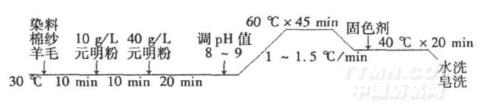取一定量的原棉紗線和羊毛散纖維,同浴精練和漂白后,采用ANOZOL活性染料一浴一步法染色。