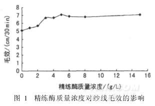 圖1中,精練酶質量濃度由1g/L提高至5g/L,紗線的毛效值顯著增大;當質量濃度超過5g/L后,紗線的毛效趨于穩定。因此,取精練酶用量以5g/L為宜。