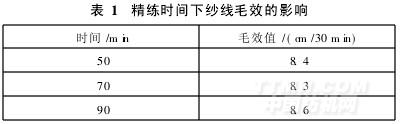 改變精練時間(50、70、90min),在精練酶用量為5g/L、滲透劑JFC為3g/L的條件下,按1.2.1(2)節方法對棉/毛混紡紗線精練,結果見表1。