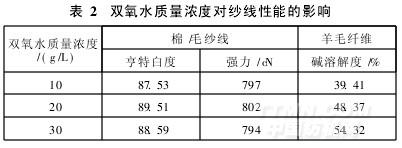 節方法漂白棉/毛紗線和羊毛纖維,測試漂后紗線的白度、強力和羊毛的堿溶解度,結果如表2所示。