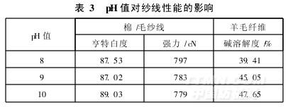 改變漂浴pH值(8、9、10),按1.2.2節方法漂白棉/毛紗線和羊毛纖維,測試漂后紗線的白度、強力和羊毛的堿溶解度,結果如表3所示。