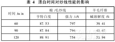 對棉/毛紗線和羊毛纖維分別漂白60、90、120min,測試漂后紗線的白度、強力和羊毛的堿溶解度,結果如表4所示。