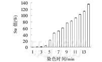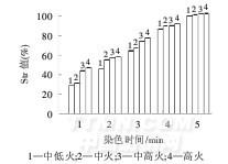 由圖1、圖2可以看出,低火加熱12min時相對色深可以達到100%,而在中低火、中火、中高火和高火下染色5min即可以達到100%;相同火力條件下,染色時間越長顏色越深;相同時間條件下,火力越大染的顏色越深;時間越長,不同火力條件下染的色深相差越小.原因是火力越大,水溫升得越快;相同火力下,染色時間越長,水溫也越高,因此腈綸越早到達玻璃化溫度或在玻璃化溫度以上的染色時間越長,染的