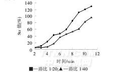 染料用量1%(owf),將織物分別在浴比1∶20、1∶40、1∶60、1∶80、1∶100時染色.因為浴比小時,火力太大會造成水分揮發快,織物易暴露在染浴外.因此,綜合考慮染色效果、時間以及節能等因素,當浴比為1∶20和1∶40時,采用低火加熱;浴比為1∶60、1∶80和1∶100時用中低火加熱,不同時間下染得織物相對色深如圖3和圖4所示.