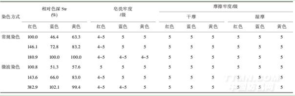 (2)與常規染色法相比,微波染色更節省時間和能源,且染色牢度和透染性與常規染色相似.微波會使織物的強力稍有下降.