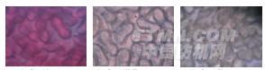 從染色織物的不同位置抽取纖維放入哈氏切片器中,涂上火棉膠,均勻切取20~30μm厚度的纖維橫截面薄片,用顯微鏡(放大倍數為640~1200X)進行觀察并拍照.