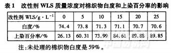 按照1.3節工藝,改變改性劑wLS質量濃度,對棉織物進行一浴法改性漂白處理,再按照1.4節工藝染色。試驗結果見表l。