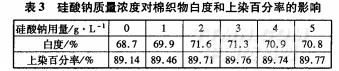 按照1.3節工藝,改變硅酸鈉質量濃度,對棉織物進行一浴法改性漂白處理。試驗結果見表3。