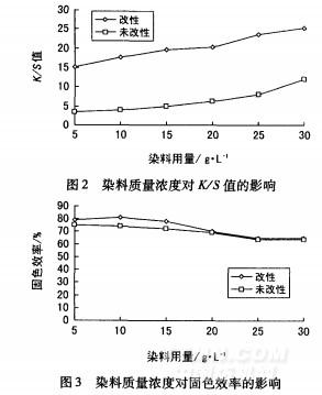 按照1.4節染色工藝,改變染料質量濃度,分別對未改性漂白和改性漂白棉織物進行染色,測試染色織物的K/S值和固色效率。結果見圖2和圖3。