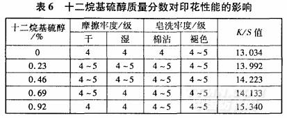 十二烷基硫醇質量分數對織物印花性能的影響見表6。