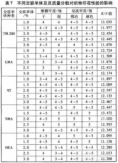 不同用量的各種交聯單體對印花織物干/濕摩擦牢度、沾色/褪色牢度及K/S值的影響見表7。