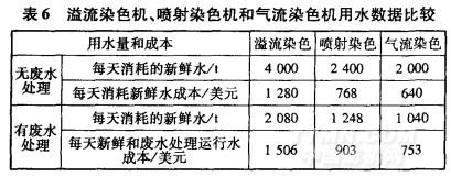 以日產量為4o噸的棉染色工廠為例,分析了采用的染色機和廢水回用對環境和經濟成本的影響。采用三種染色設備——溢流染色機、噴射染色機和氣流染色機。表5是工廠的一些運行數據。溢流染色機、噴射染色機和氣流染色機的染色浴比分別是1:10,1:5和1:4。每千克棉在這三種染色機中進行前處理、染色和后處理的用水量分別是100,60和5OL。
