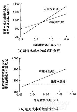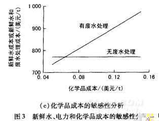 表6是采用3種染色設備的用水數據。溢流染色機每天需要4000t新鮮水,遠高于噴射染色機(2400t)和氣流染色機(2000t)。Kazakevieiute等對噴射染色機和氣流染色機的水、熱能和化學品的消耗量進行分析比較,也發現后者的消耗量更少。如果采用此廢水處理廠,那么48%的水可回用于染色工藝。對于溢流染色機、噴射染色機和氣流染色機而言,每天新鮮水的消耗量可分別減少到2080,l248和1040t。假設每噸水的價格是0.32美元,那么采用這3種設備時新鮮水和廢水處理的總成本分別是每天1506,903和753美元。圖3(a)的敏感性分析(譯注:敏感性分析法是指從眾多不確定性因素中找出對投資項目經濟效益指標有重要影響的敏感性因素,并分析、測算其對項目經濟效益指標的影響程度和敏感性程度,進而判斷項目承受風險能力的一種不確定性分析方法)表明,一旦新鮮水的價格超過0.44美元/噸,工藝用水的回用將會更加經濟。這一結論表明,對于印染廠,工藝用水回用帶來的經濟性是非常吸引人的。圖3(b)和圖3(c)的電力(0.03美噸)和化學品(0.06美元/噸)成本數據也顯示了相似的結論。