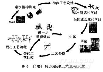 圖4是一個廢水處理廠開發(fā)的廢水處理工藝流程示意,它強調(diào)了工藝開發(fā)過程中迭代的重要性。首先是廢水指標(biāo)的測定,隨后根據(jù)經(jīng)驗或做嘗試性的初步工藝方案設(shè)計,然后篩選化學(xué)品(實驗室合成或購買)、小試和中試,在試驗中獲得沉淀池的色度去除效率、吸附速率常數(shù)、吸附容量和反滲透膜的擴散效率等參數(shù)。對一些替代工藝進(jìn)行評估以確定最佳工藝。通常,還要進(jìn)行其它的試驗以獲得一些補充數(shù)據(jù),從而對設(shè)計方案進(jìn)行改進(jìn)。