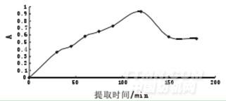 由圖1可以看出,隨著提取時間的增加,吸光度增加,當時間為120min時達到最大,再延長提取時間吸光度值開始降低。因此選擇提取時間為120min。
