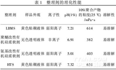 織物:20s×16s+70D/108×56全棉彈力紗卡漂白布、黑色布(活性染料染色),240T滌綸春亞紡漂白布、黑色布(分散染料染色).藥品:新型線性嵌段共聚有機硅整理劑LBMS(自制),聚醚改性有機硅柔軟劑(簡稱聚醚硅油,市售),氨基改性有機硅柔軟劑(簡稱氨基硅油,市售),[AB]n線性嵌段改性有機硅整理劑HTS(邁圖高新材料集團).它們的理化性能見表1.