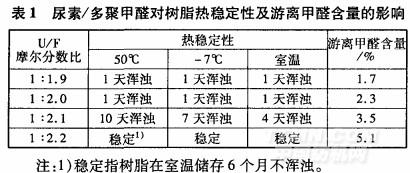 由表1可知,隨著尿素/多聚甲醛摩爾分數比減少,樹脂的熱穩定性提高。當U/F<1:2.0,樹脂含亞胺基多,樹脂熱穩定性差;當U/F>1:2.0時,樹脂中生成的羥甲基基團增多,甲醚化后穩定性提高。從表1可以知道,當U/F=1:2.2時,樹脂液非常穩定;而隨著U/F摩爾分數比的減少,游離甲醛增加。本試驗選取U/F=1:2.1。