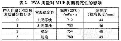 聚乙烯醇(PVA)是一種很好的膠黏劑,能與甲醛或脲醛的初縮體進行反應,增加樹脂的黏著力,同時具有一定的捕醛作用。改性劑PVA的加入量對MUF樹脂的穩定性影響見表2。