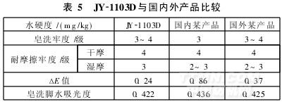 由表5可知,在一般染廠條件下, JY-1103D與國內外同類產品相比具有良好的皂洗牢度和干濕摩擦牢度,尤其對色光影響小,具有很高的性價比。