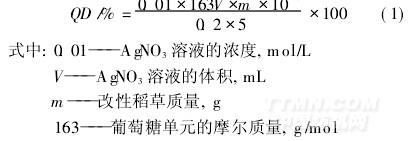 取0. 2 g按1. 2節方法配制的稻草秸稈季銨鹽,用100 mL去離子水溶解,攪拌均勻;以0. 01 mol/L AgNO3溶液通過電位滴定法測Cl-濃度,其季銨化度(QD)按式(1)計算: