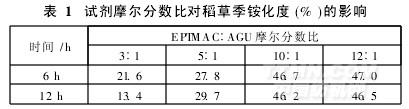 由2. 1. 1節試驗結果可知,雖然反應時間為12 h時季銨化度最高,達27. 5%,但較反應時間6 h的季銨化度(26. 7% )僅提高了0. 8%。所以,當稻草質量5. 0 g,NaOH質量分數3%,反應時間為6 h和12 h,溫度為85℃時,分別討論反應試劑EPTMAC∶AGU摩爾分數比對稻草季銨化度的影響,結果見表1。