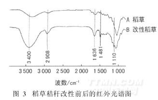 由圖3可知,稻草改性處理前后在1 636 cm-1處均有吸收峰,此處為葡萄糖單元AGU的伸縮振動;改性稻草在1 481 cm-1處出現新的吸收峰,此吸收峰為季銨鹽上的—CH3[2];在2 908 cm-1處的吸收峰代表稻草中脂肪鏈上的C—H鍵[12]; 1 110 cm-1處的吸收峰為C—O鍵的伸縮振動。通過對比分析可知,稻草秸稈中引入了季銨鹽基團。