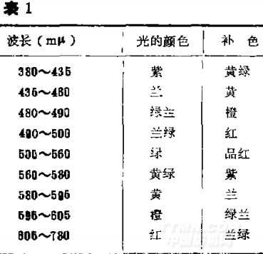 光的波長范圍大約在&.8×1O 厘米(即38Om )和7.8×10 (即780mp.)之間,是能對人們的視覺器官引起視覺的部分。由一個波長的光波所組成的光叫單色光。不同渡長的單色光,在人的視覺上產(chǎn)生不同的色。一定波長的光與另一定波長的光.若以適當?shù)谋鹊够旌希苌勺怨猓@二種光便相互稱為補色。例如:一定量的黃光和蘭光混合后,成為自光,于是黃光與蘭光便互為補色。一種染料能選擇吸收蘭光,則它較多地反射黃光,此染料呈黃。若染料較多地吸收綠光,則此染料呈品紅色。若該染料對可見光各波段的光波能平均l吸收,則此染料呈灰色。不同波長的光,所呈現(xiàn)的色澤及其補色,如表l所示。