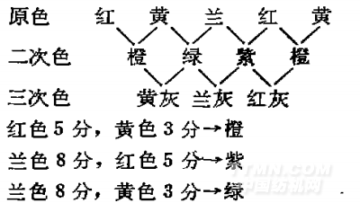 在日常的生產(chǎn)中,品種顏色越來越多,很多顏色只靠單一染料染色不行,一定要靠拼色來解決。在具體拼色的過程中,常將紅、黃、蘭三色稱為三原色或基本色。以不同量的三原色,可以拼出不同要求的色光。二種原色混合后,所得到的顏色稱為二次色。二次色相互配成的顏色叫三次色。它們關系如下: