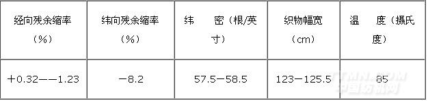 天絲纖維及300D(T400系列)纖維具有相同的特點(diǎn),即吸濕快、彈性好,預(yù)縮過程中極易產(chǎn)生折皺。為了能夠保持穩(wěn)定的定型,又能體現(xiàn)其良好的彈性效果和獨(dú)特的布面風(fēng)格,我們對(duì)溫度、車速、橡膠毯的擠壓度進(jìn)行反復(fù)的調(diào)整和試驗(yàn),燒毛、預(yù)縮后盡量減少在布板上或車輛內(nèi)的放置時(shí)間,通過技術(shù)攻關(guān)和多次試驗(yàn),選擇了適合于天絲/棉織物的預(yù)縮工藝,并進(jìn)行嚴(yán)格控制,取得了良好的效果。預(yù)縮工藝如下: