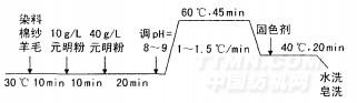 取一定量的原棉紗線和絲光羊毛散纖維,同浴精練和漂白后,采用直接/酸性染料一浴法染色引。