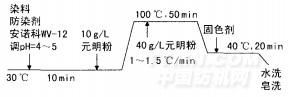 藥品乙酸、無水硫酸鈉、磷酸三鈉(均為分析純國藥集團化學試劑有限公司);乙二胺四乙酸二鈉(EDTA,分析純,中國醫藥上海化學試劑公司);氨水(分析純,上海聯試化工試劑有限公司);無水碳酸鈉(分析純,上海虹光化工廠);安諾科wV.12(勻染劑)安諾素黃S3R 150%、安諾素紅S3B 150%、安諾素藏青SGN 150%、安諾賽特黃R、安諾賽特紅3G、安諾賽特藍R(安諾其紡織化工);防染劑FRN、固色劑ECO沙拉菲尼爾黃ARLE 154%、沙拉菲尼爾紅4GE、沙拉菲尼爾藍FGLE 220%(亨斯邁紡織染化) 儀器AL 104電子天平[梅特勒一托利多儀器(上海)有限公司]、HH4數顯恒溫水浴鍋(江蘇省金壇市榮華儀器制造有限公司)、101A一1B電熱鼓風干燥箱(上海安亭科學儀器有限公司)、Color—Eye 7000A測配色儀(美國Gretag Macbeth公司)