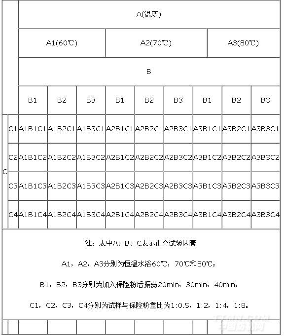 取試樣1.0g,置于反應器中,加入30ml預熱到(70±2)℃的檸檬酸鹽緩沖溶液,將反應器密閉,用力振搖,使所有試樣浸于緩沖液中,置于恒溫水浴內,并在不同溫度下(60℃,70℃,80℃)保溫30min,使所有試樣充分潤濕后,再加入不同量的保險粉(按試樣與保險粉量比1:0.5,1:2,1:4,1:8)振蕩(20min,30min,40min)。具體試驗組合如表1