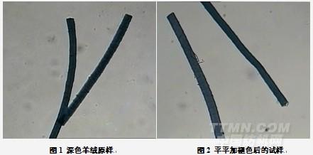 根據標準GB/T16988-1997附錄B,對深色羊絨紗線采取平平加褪色,褪色后的羊絨試樣與原樣相比,兩者色差不到半級。褪色前后纖維在電子顯微鏡下的形態如圖1和圖2,從圖2中觀測仍然困難,可見平平加褪色效果不明顯??赡艿脑蚴茄蚪q屬于蛋白質纖維,耐酸不耐堿,在染色過程中多使用酸性染料染色,酸性染料在水中電離成色素陰離子。在酸性條件下,能與蛋白質纖維上的氨基正離子反應而上染纖維,而平平加對染料分子具有相當好的去親和力,不能剝去纖維上的染料[3]。且由于羊絨皮質細胞的巨原纖結構、細胞化學組分與羊毛不同,而且纖維細度明顯小于羊毛。因此,羊絨對熱比較敏感,在高溫沸煮下羊絨鱗片更易發生損傷,露出皮質層使纖維水解更加嚴重 [4]。