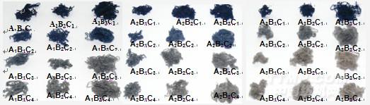 圖3表明,試樣褪色效果在不同條件下具有顯著性的差異。褪色程度與溫度、振蕩時間和保險粉加入量有關,可以看出兩點規律:(1)深藍色羊絨紗線在同等試驗條件下,試樣在恒溫水浴中振蕩的溫度越高,時間越長,試樣褪色效果越好。(2)試樣與保險粉的量比越大,試樣的褪色效果越好。