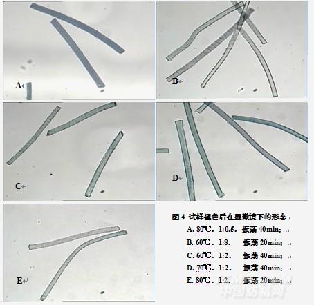 (2) 保險粉法褪色處理后試樣在顯微鏡下的形態:圖4和圖5