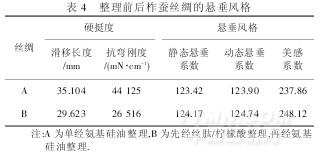 由表4 可知,先經絲肽/檸檬酸整理,再經氨基硅油整理后的柞蠶絲織物更加柔軟,懸垂風格得到進一步改善.