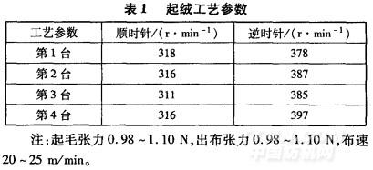 使用MB331E型起絨機雙彎針平板面起絨機4臺,工藝參數見表l。