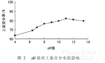 由圖2知,當改性液pH值從4增加到11時,活性染料對改性木棉的上染率由63. 5%增大到81. 9%。這可能是因為溶液堿性增強,提高了改性劑與纖維素纖維的反應性,從而提高染料的上染率。當改性液pH值大于11后,再繼續增大其堿性,上染率略有下降。