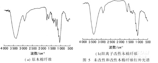 分子間氫鍵越強,—OH峰向低波數方向移動;反之,—OH峰則向高波數方向移動。圖5(b)中,陽離子改性木棉纖維—OH的伸縮振動吸收峰在3 417 cm-1處,與原木棉纖維相比,—OH峰向高波數方向移動,可見陽離子改性木棉纖維分子間氫鍵減弱。這可能是由于陽離子改性劑與纖維素發生反應,生成新的—OH基團,故還存在—OH的伸縮振動吸收峰,但是削弱了纖維素分子間氫鍵的作用,致使—OH峰向高波數方向移動。