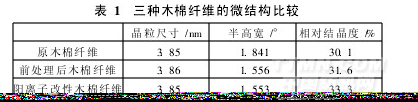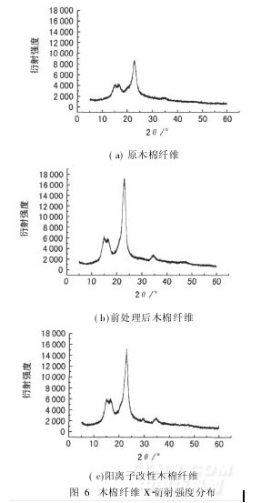圖6(a)、(b)和(c)分別是原木棉纖維、經前處理和8% (owf)陽離子改性劑SA于75℃處理45 min后的木棉纖維的X射線衍射強度分布。表1為在2θ=23°處衍射峰的半高寬及計算得到的纖維晶粒粒徑和結晶度的對比。