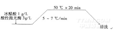 生物酶處理后成衣的白度和毛效與常規(guī)處理相當,強力保留率較高,染色后成衣的外觀色澤能長久保持,其耐摩擦、皂洗色牢度也均與常規(guī)處理成衣相當[4]。生物酶前處理工藝曲線如下: