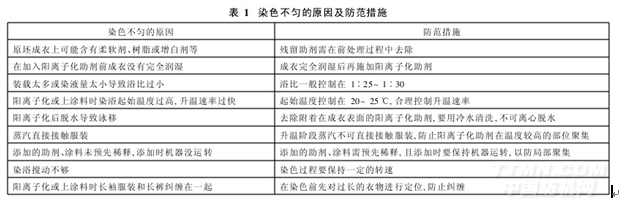 前處理及染色過程中,由于工藝處方或操作不當,會引起染色不勻,其原因及防范措施見表1。
