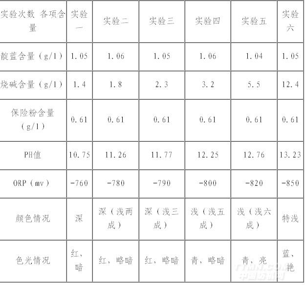 普通牛仔布常用紗83.3tex 紗,每束10根頭份(共六束60根),取車間正常染液,即靛藍含量約1.0g/l、燒堿含量1.4-1.6 g/l、保險粉含量0.61-0.74 g/l、PH值10.70左右,放入小樣機染槽中,配好煮煉液,測試染液各項含量,做好準備工作,以5m/min的車速開車,開車過程中保持染液各含量一致,開出紗樣為實驗一紗樣。在保證其它參數基本不變的條件下,約以0.5的等差提高染液PH值,即通過增加燒堿含量來提高,以此開車開出樣分別為實驗二至實驗六紗樣。