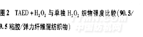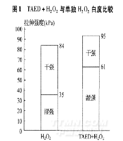 由于TAED具有低溫漂白作用,促進(jìn)了纖維素纖維、蛋白質(zhì)纖維等紡織品的低溫氧漂工藝的應(yīng)用[3-6],在低溫條件下白度明顯高于單獨(dú)使用雙氧水,減少纖維在高溫下的損傷程度[7]。圖1和圖2顯示TAED+H2O2和單獨(dú)H2O2的白度值和拉伸強(qiáng)度的比較。它們是在pH=10·5,溫度70℃, 1小時氧漂工藝條件下的結(jié)果。