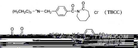 繼TAED和NOBS之后,又開發(fā)了陽離子型季銨鹽類過氧化物的活化劑品種,美國北加州大學(xué)紡織學(xué)院和土耳基伊斯坦堡大學(xué)對陽離子活化劑的合成和應(yīng)用進(jìn)行了研究。在N-酰基己內(nèi)酰胺(N-AcylCaprolactam)類中,已開發(fā)應(yīng)用的2只品種為:N 4(三乙基銨甲撐)苯酰基己內(nèi)酰胺氯化物(N 4(TriethylAmmoniomethyl)benzoyl caprolactam chloride,簡稱TBCC)和6 N,N,N-三甲基銨甲撐己酰基己內(nèi)酰胺對甲苯磺酸(6 N,N,N-Trimethylam-monio hexanoyl caprolactam p-toluenesulfonate,簡稱THCTS)。它們的分子結(jié)構(gòu)式如下: