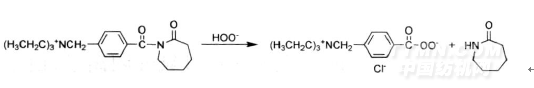 同時還可能產(chǎn)生TBCC的水解和二酰化反應(yīng),得到的N-4-三乙基銨甲撐苯甲酸和過氧化二酰化合物,都沒有漂白活化作用,以上兩反應(yīng)都是在pH下降的情況下產(chǎn)生的,TBCC活化最佳pH值是11.6。
